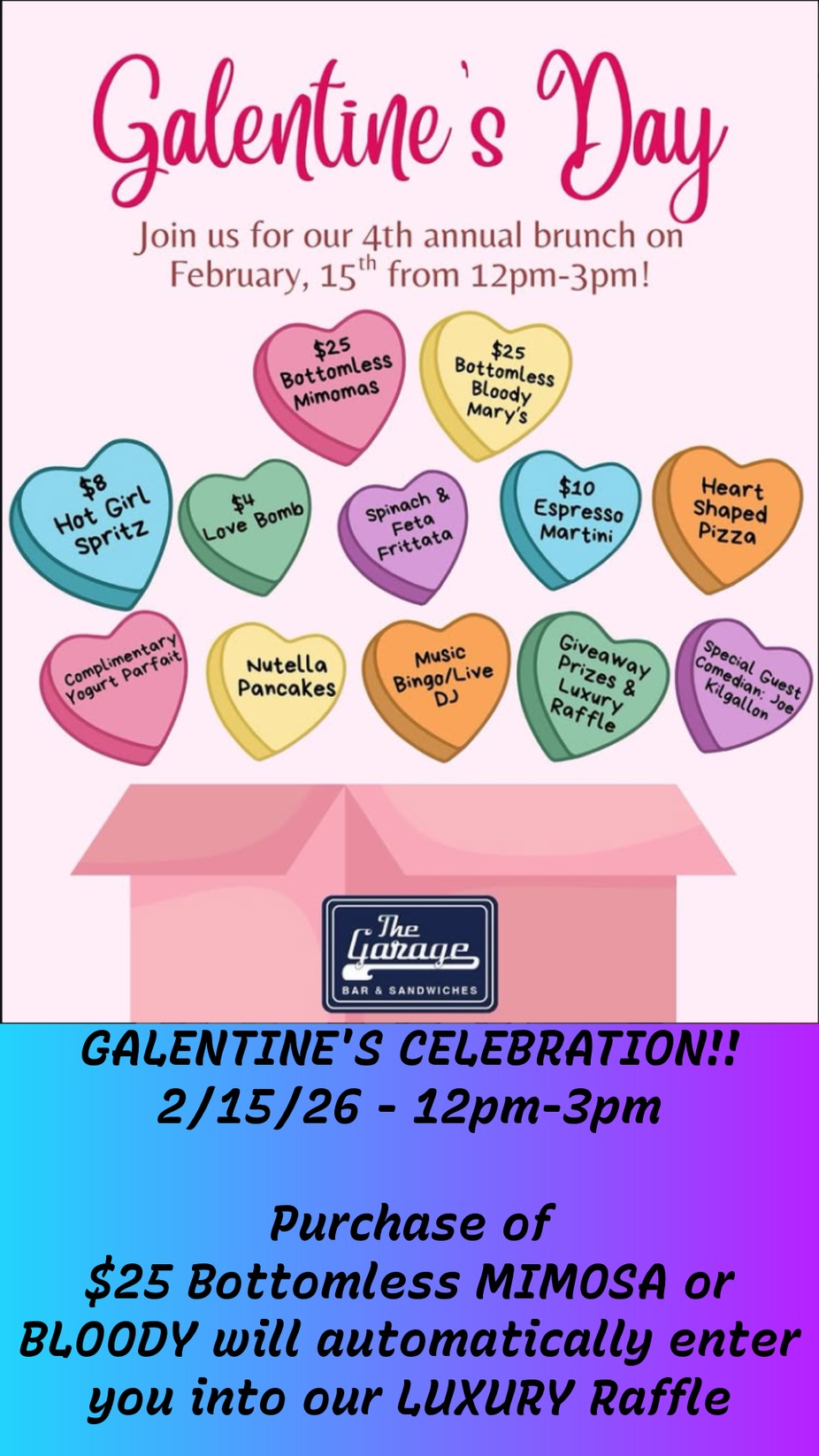 Join us on February 15th for our 4th annual Galentine’s Day event! Our brunch will be held from 12pm-3pm. You don’t want to miss it! With a purchase of our $25 bottomless Mimosas or Bloody Mary’s, you will be automatically entered into our raffle! More information is included on the image! Reservations are encouraged! We’ll see you then! 🥂💋🥞🩷
